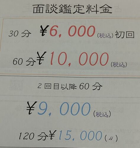 京です。 鑑定料金ですが再度お伝えをさせて頂きます。 初めての方は 30分6,000円 60分10,000円となります。 2回目以降は 60分9,000円 120分15,000円となります。 基本 紹介が必要になりますのでお願いいたします。 合わせて女性の料金となりますのでお願い…